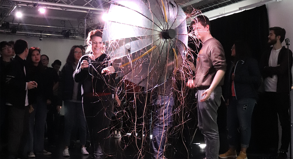 // Cécile Chevalier & Chris Kiefer are a FR/UK artist duo who test out the sonic, physical and technological boundaries of collective experiences through interactive sound art. They locate their work within cybernetics and systems art, drawing on new algorithmic and material technologies, creating technologically altered perception and playful interactive experiences. The collaboration is equal in merging together systems aesthetics, musicology, sound and material aesthetics, instrumentalist and computer science.